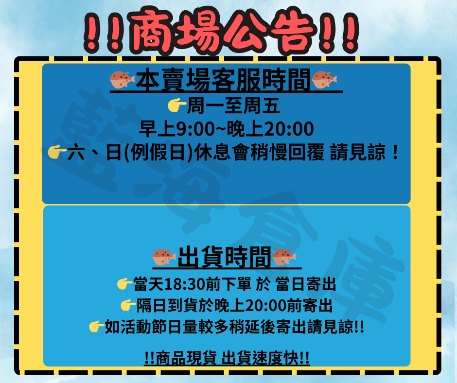 🐳 賣場商品下單完成後,各項現貨將依賣場首頁公告出貨流程出貨。