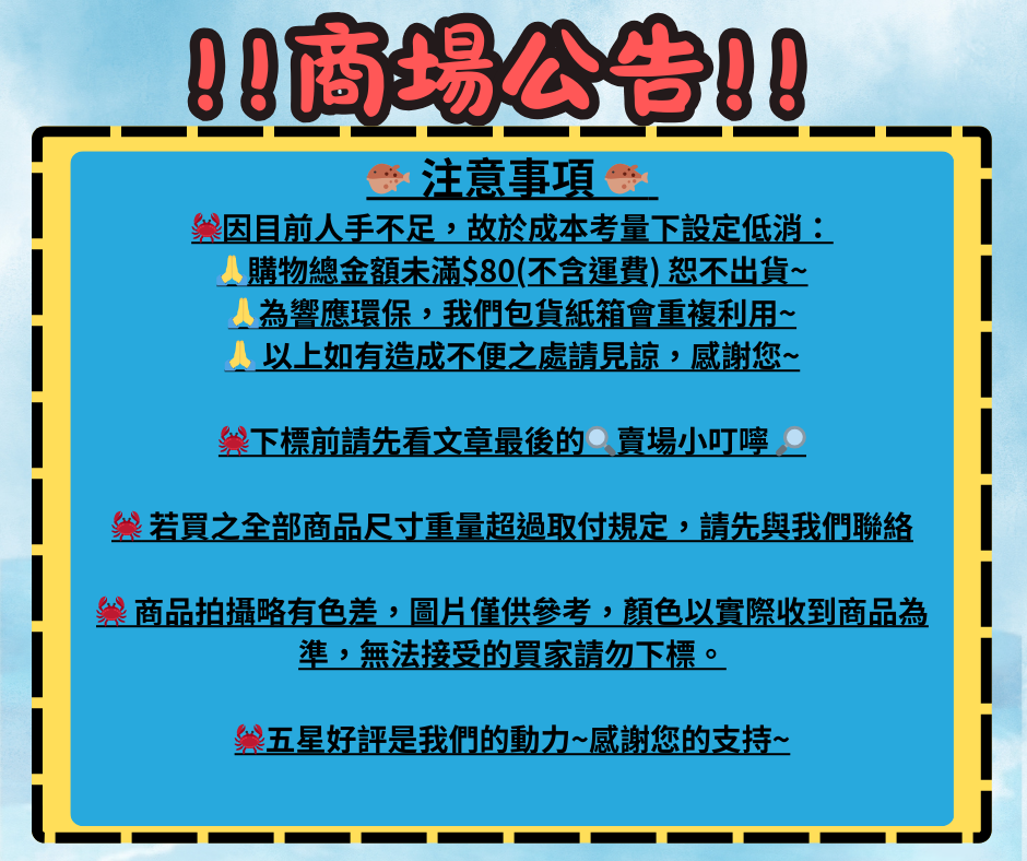 🐳 賣場商品下單完成後,各項現貨將依賣場首頁公告出貨流程出貨。