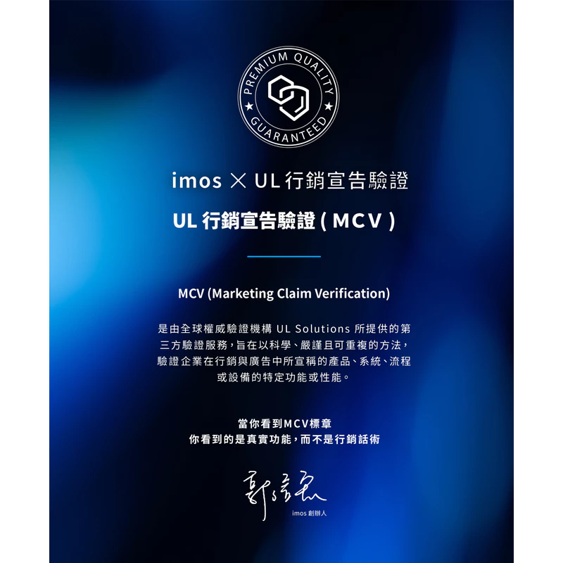 在 UL Solutions 的 MCV(行銷宣告驗證)中,imos 確定成為全球首家 3C 配件通過 CPF60 晝夜節律防護係數驗證標準的品牌。
