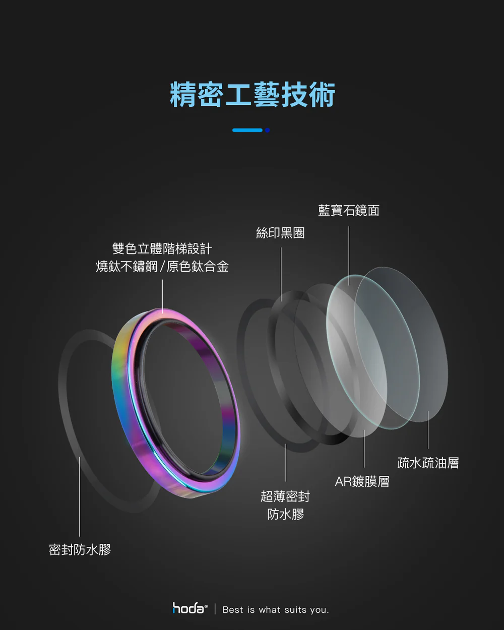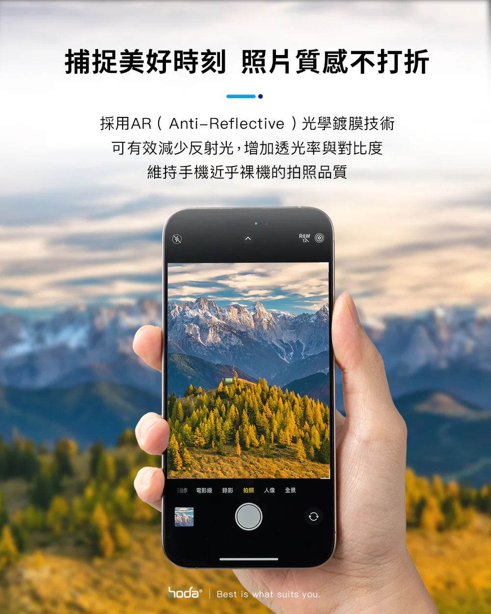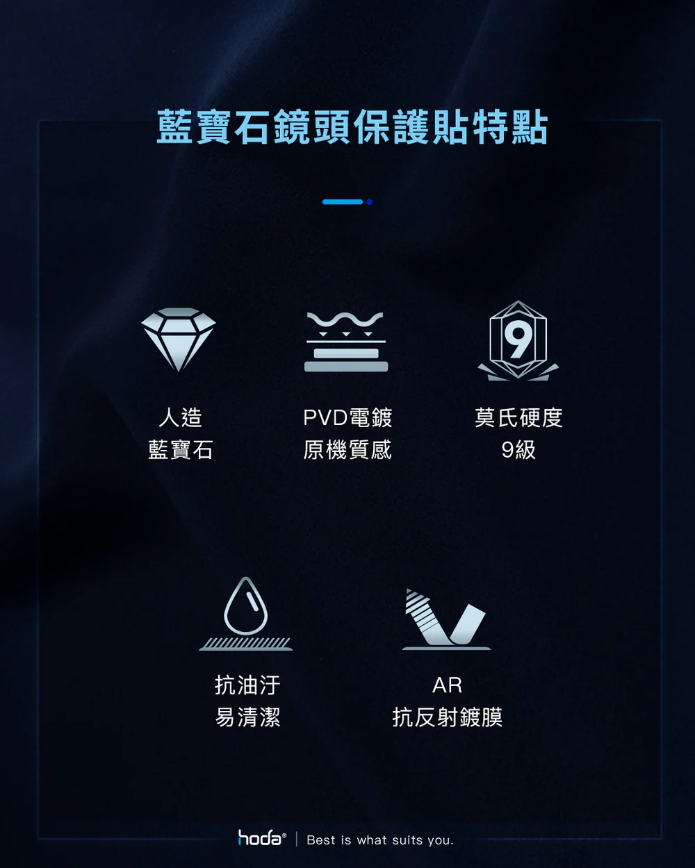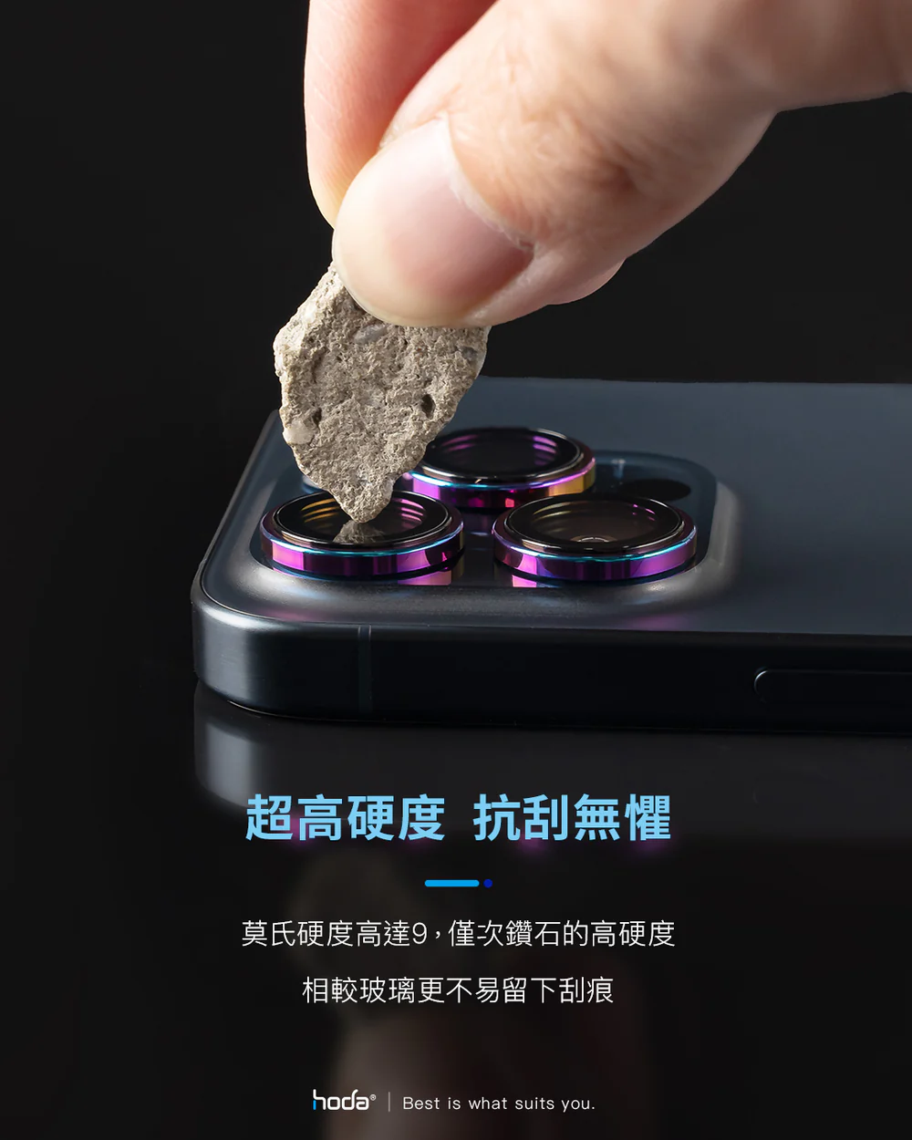 hoda藍寶石鏡頭保護貼採用Anti-Reflection光學鍍膜技術,它通過減少光的反射而增加透光率與對比度,維持手機照相品質不失真。