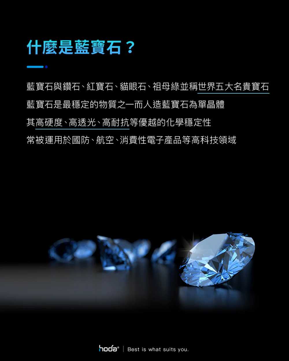 藍寶石是全世界最穩定的物質之一,而人造藍寶石因單晶體,化學穩定性更強並具有一流的強度、耐抗性及極良好的透光性。