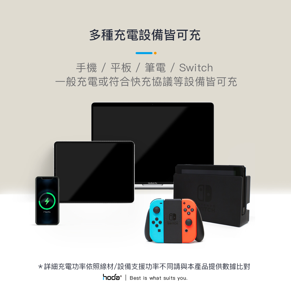 單獨使用USB-C(PD)接時,最高可為設備提供100W(MAX)的充電功率,支持PD快充協議。