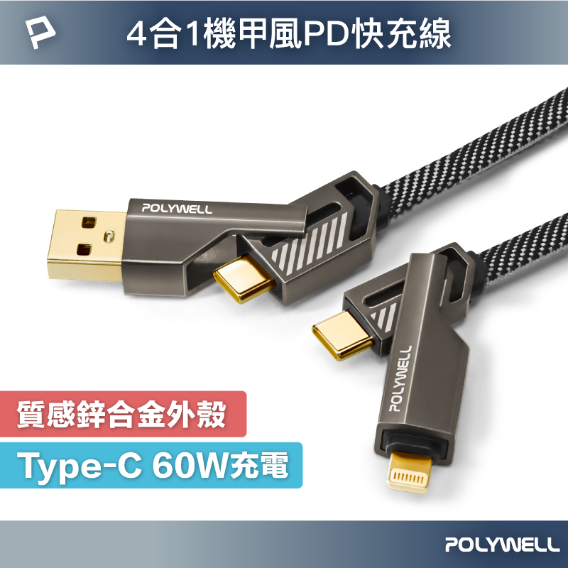 ◎ 品名: USB-A + Type-C + Lightning 四合一機甲風PD編織快充扁線