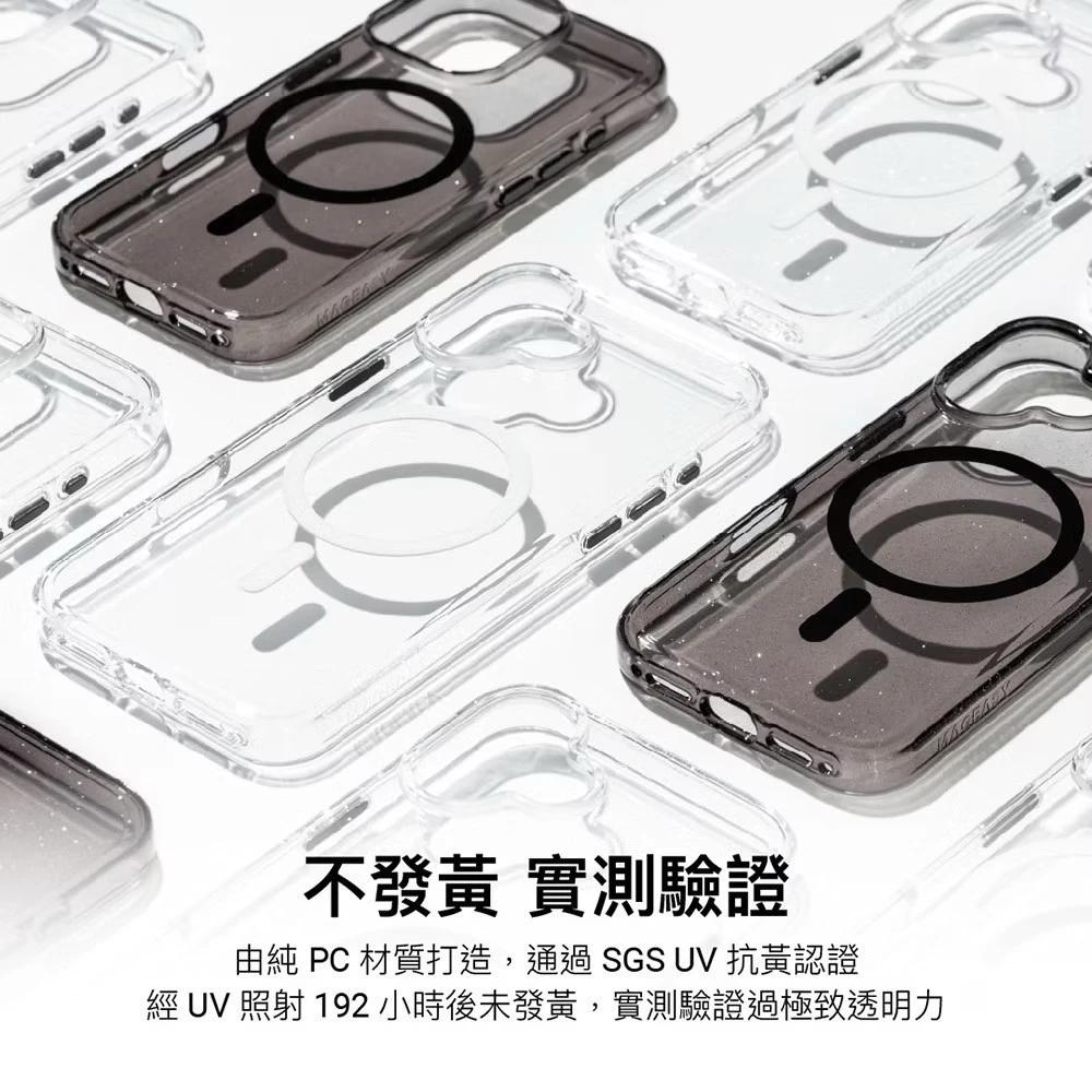 由純 PC 材質打造,通過 SGS UV 抗黃認證,經 UV 照射 192 小時後未發黃,實測驗證過極致透明力