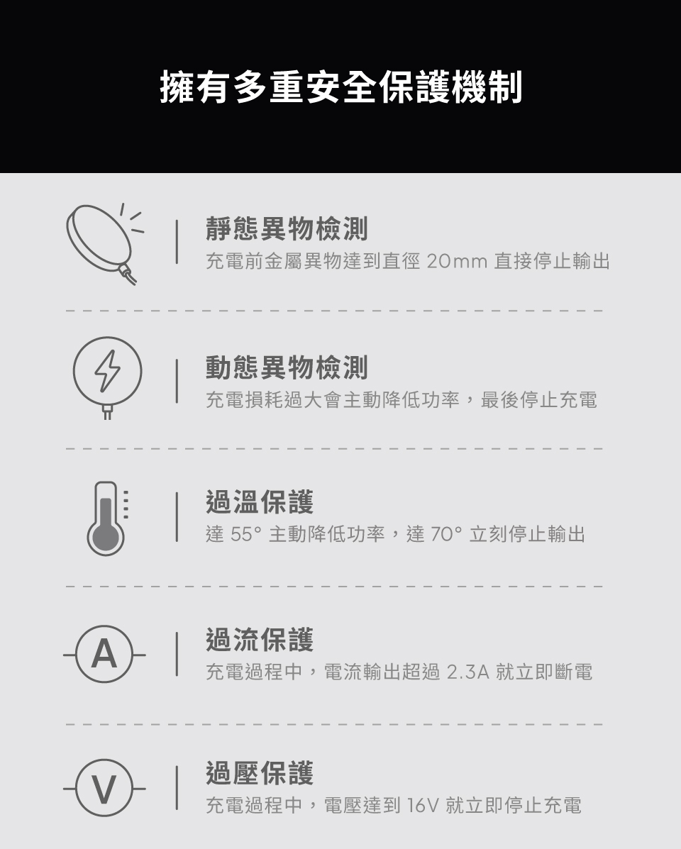 • 異物檢測 / 過流 / 過壓 / 過溫 全面防護