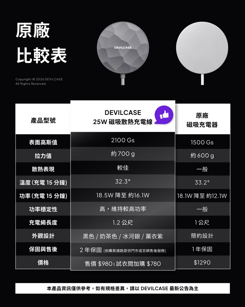DEVILCASE 25W 磁吸散熱充電線在磁力與穩定度上表現更好,