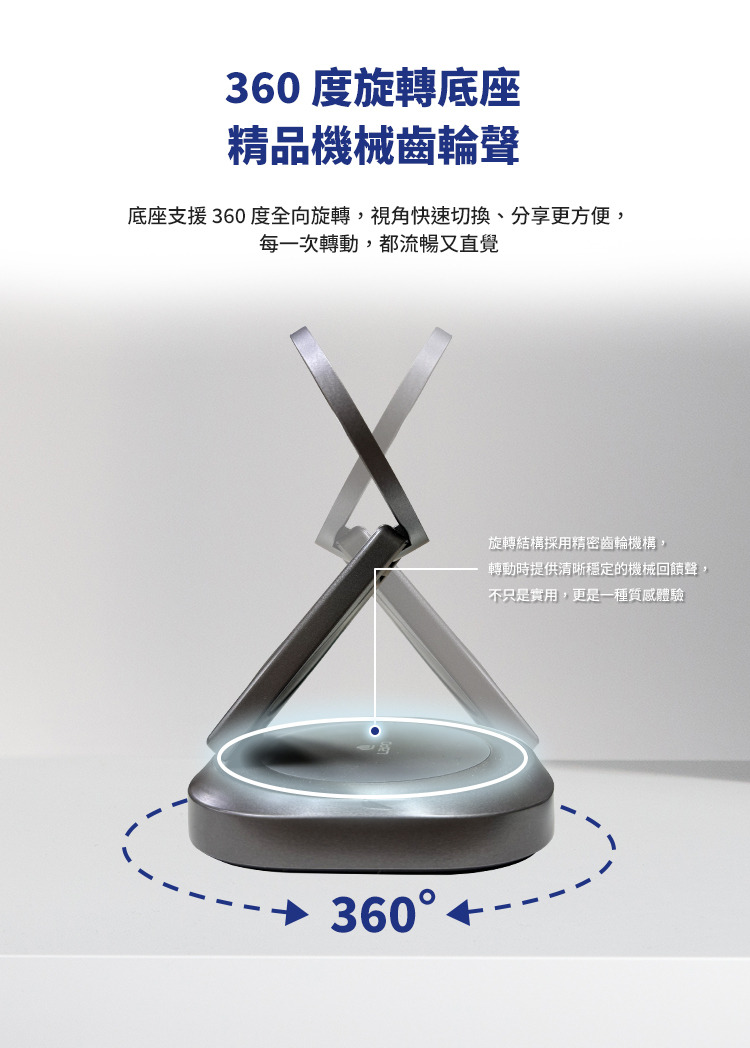 ・360° 旋轉底座設計,視角自由調整,個人使用或分享畫面都方便