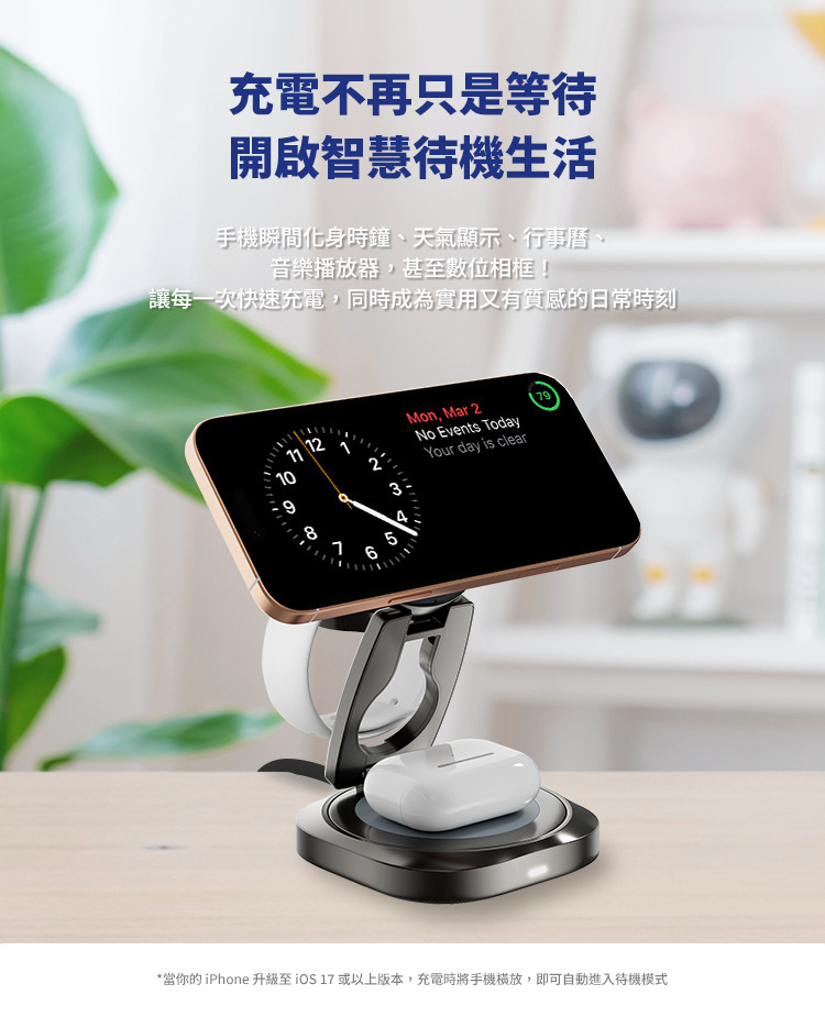 ・支援 3 裝置同時充電,一次滿足手機、智慧手錶、無線耳機
