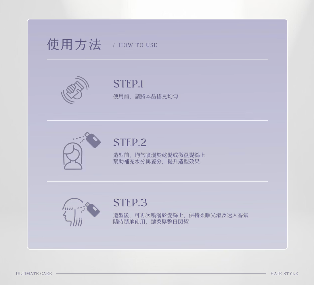 ✔ 洗髮後擦至半乾,距離 10–15 公分噴於髮絲中段至尾段