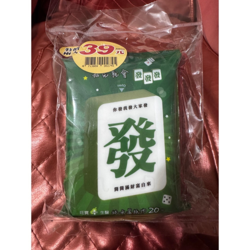 「開運麻將旺寶濕紙巾」,直接把麻將最吉利的「發財」跟「紅中」變成隨身型濕紙巾,可以當隨身幸運小物😊