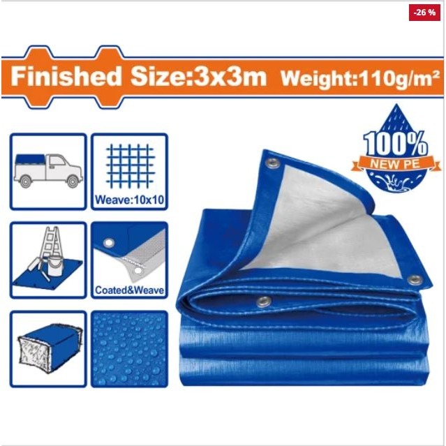 | 聚乙烯尺寸:3m*3m(英尺:9.8x9.8)材質:100%全新PE重量:110g/m2編織:10*10網厚度:0.15mm每100公分有鋁製索環,方便係緊兩面都採用100%全新PE層壓和塗層非常適合防水;防雪、防塵、防紫外線 |