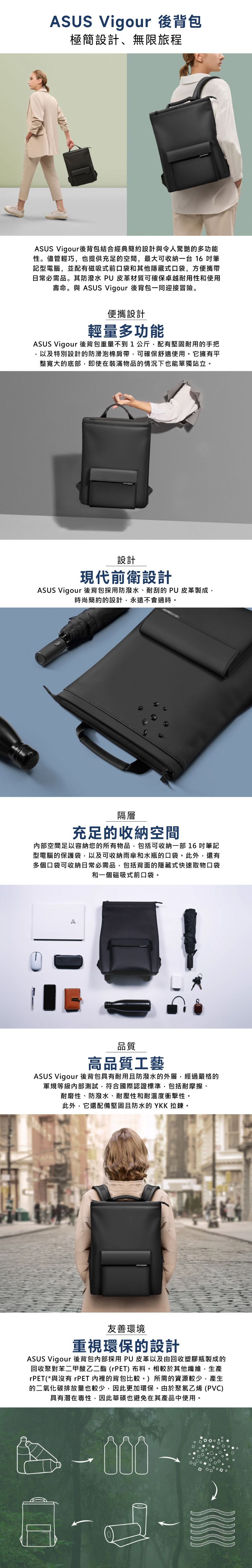 ASUS Vigour後背包結合經典簡約設計與令人驚艷的多功能性。儘管輕巧,也提供充足的空間,最大可收納一台 16 吋筆記型電腦,並配有磁吸式前口袋和其他隱藏式口袋,方便攜帶日常必需品。其防潑水 PU 皮革材質可確保卓越耐用性和使用壽命。與 ASUS Vigour 後背包一同迎接冒險。