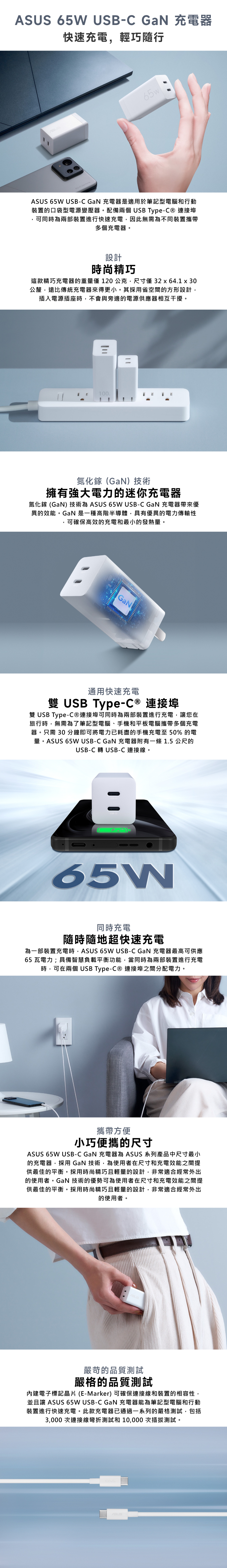 ASUS 華碩 65W 雙埠 氮化鎵 GaN 電源供應器 PD 充電器 快速充電 筆電 手機 平版