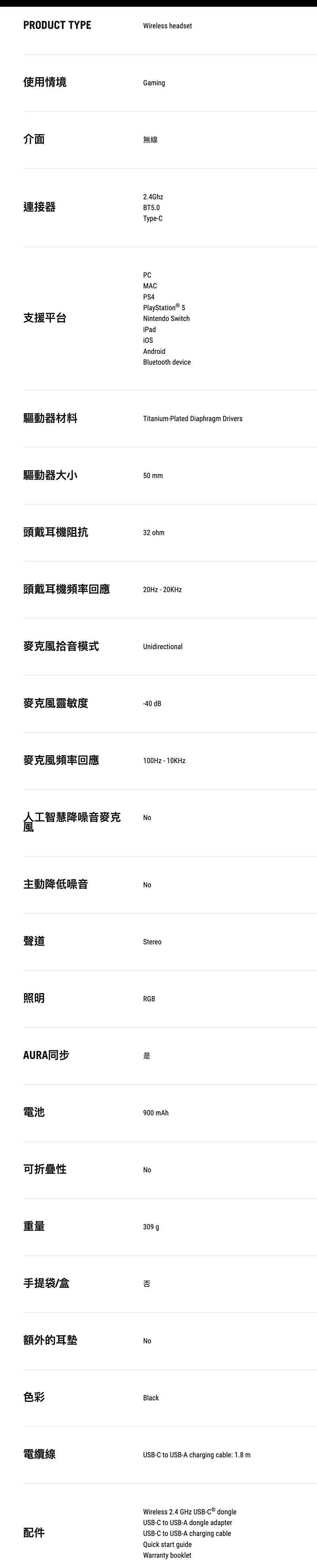 此款三模連線 RGB 電競耳機採用 ROG SpeedNova 無線連接技術,並具備 50 mm ROG 鍍鈦振膜驅動單體、精心調校無線音效、10 mm 超寬頻吊桿式麥克風、輕量 309 g 設計,以及 ASUS Aura Sync RGB 燈光效果​