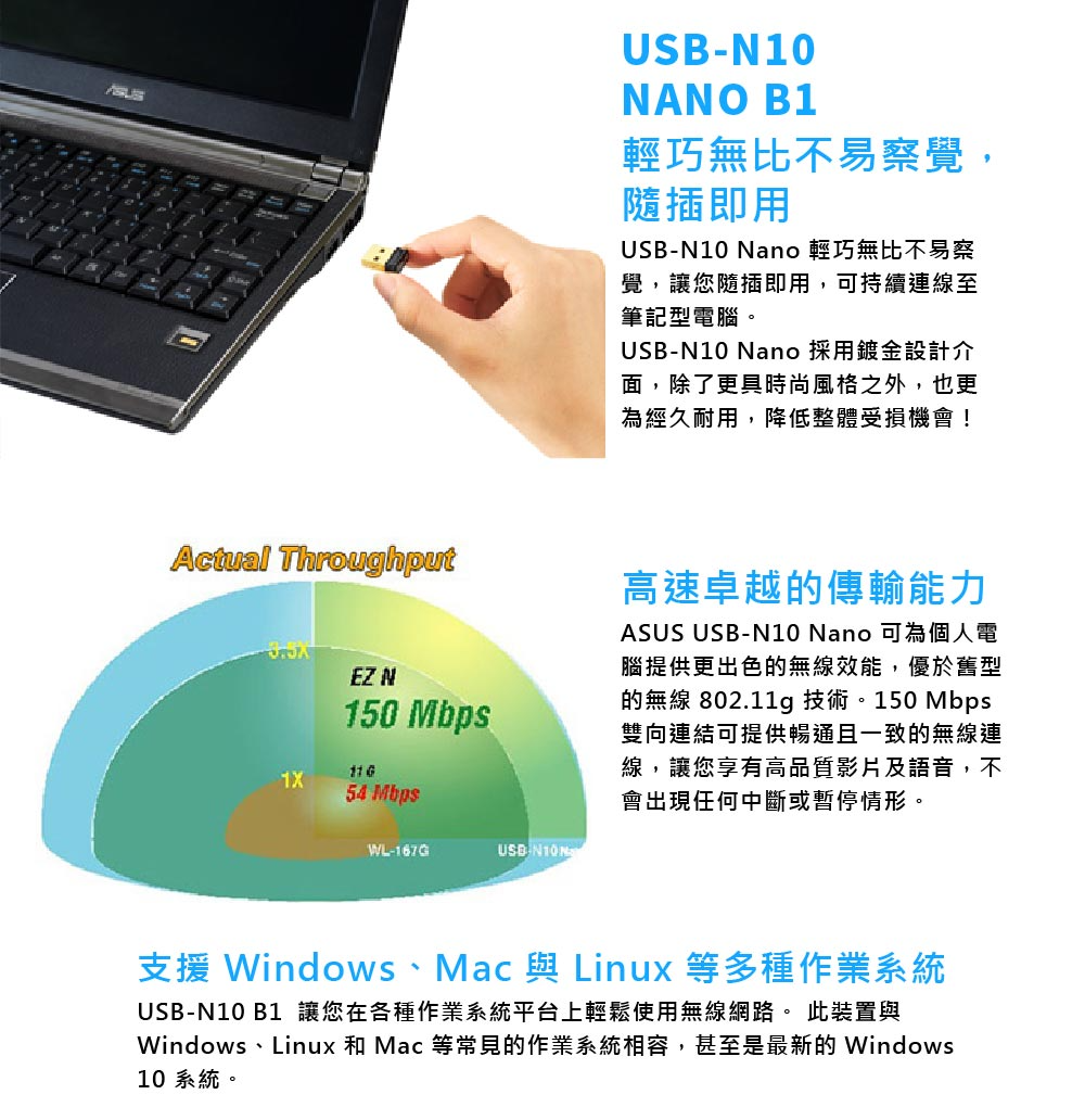 USB-N10 外形精巧,以 150 Mbps 雙向連接提供暢通且一致的無線連網。