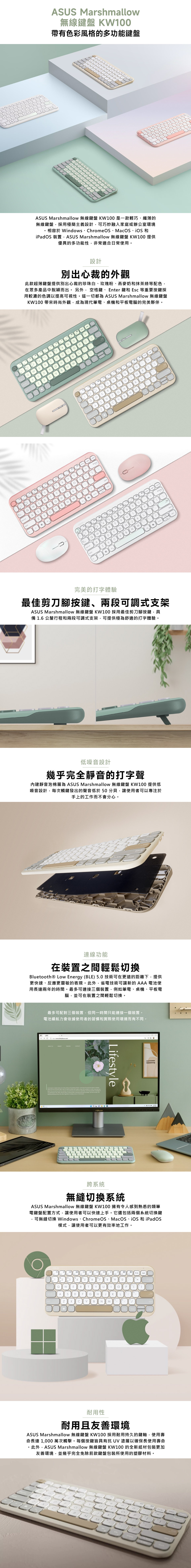 ASUS Marshmallow 無線鍵盤 KW100 是一款輕巧纖薄的無線鍵盤,採用極簡風格設計,可完美融入家庭或辦公室。相容於 Windows、ChromeOS、MacOS、iOS 和 iPadOS 裝置,ASUS Marshmallow 無線鍵盤 KW100 提供優異多功能性,非常適合日常使用。
