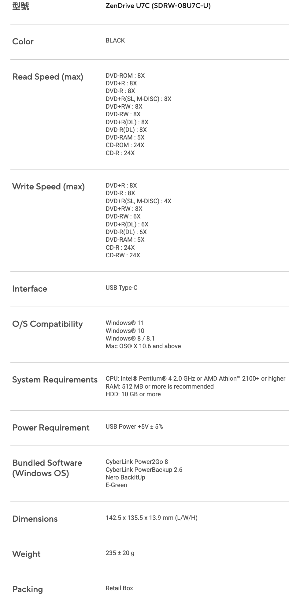 ASUS 華碩 ZenDrive U7C (SDRW-08U7C-U) 可攜式光碟機(燒錄)