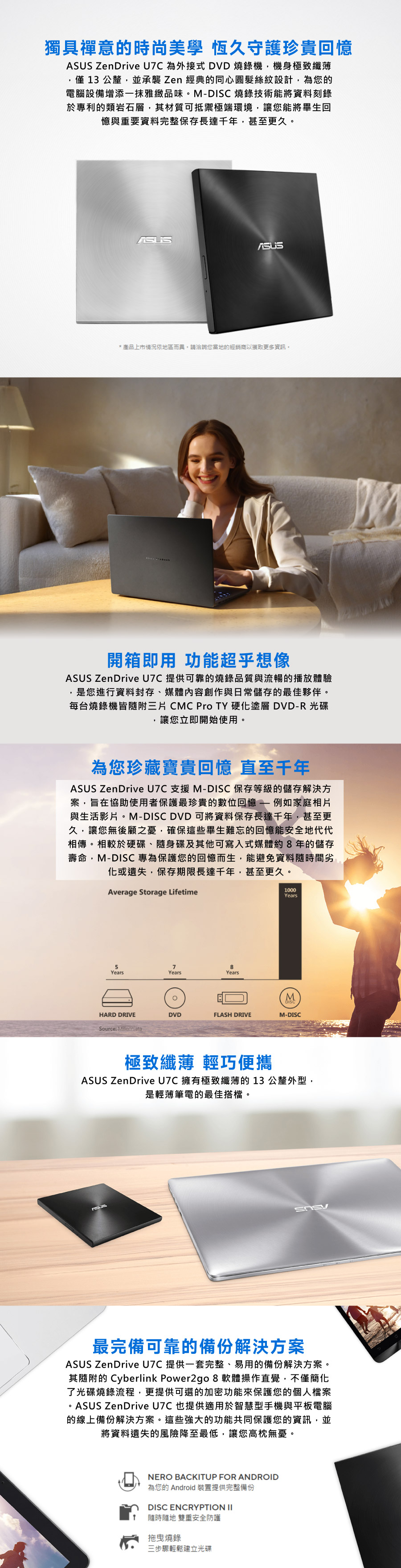 ASUS ZenDrive U7C - 超薄可攜式 8X DVD 燒錄機,內附三片免費 Hardcoat 光碟,完整支援照片、影片與資料備份,適用於 Windows 與 Mac OS