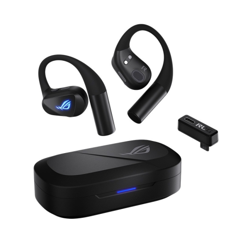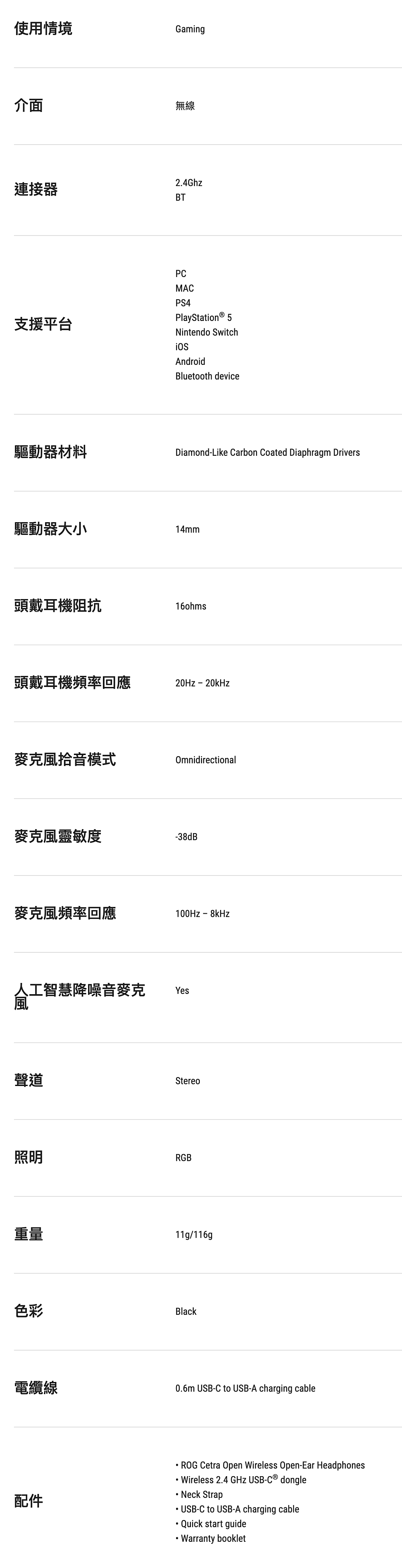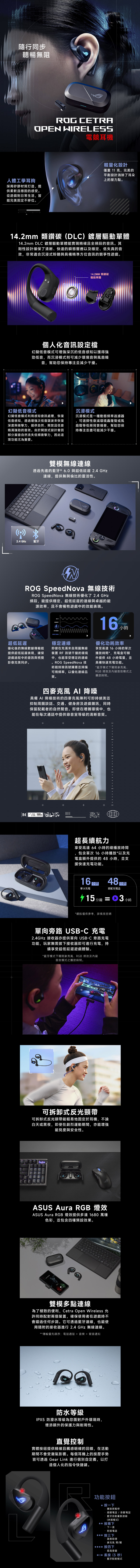 ROG Cetra Open Wireless 電競耳機具備藍牙® / 2.4 GHz 雙模連線,搭載 ROG SpeedNova 無線技術,支援 USB-C 單向同步充電、14.2 mm 類鑽碳 (DLC) 驅動單體、開放式耳道設計、可拆卸反光頸帶,以及具備 AI 降噪技術的四麥克風陣列。