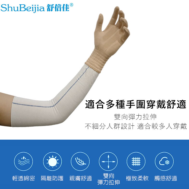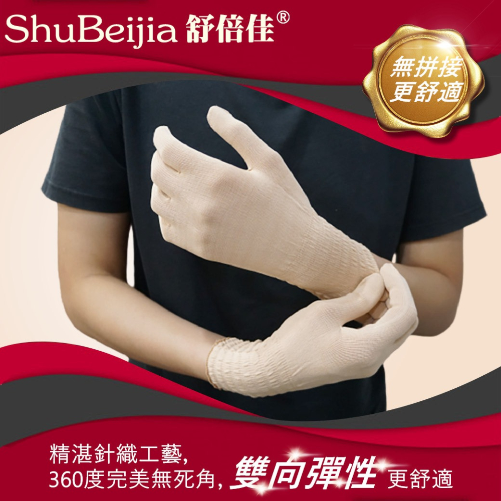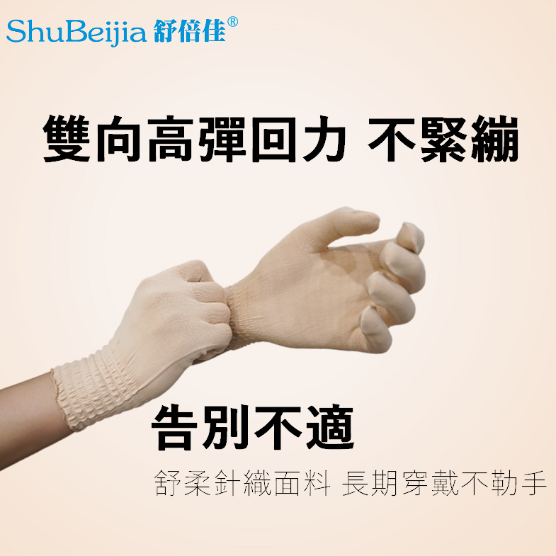 ShuBeijia舒倍佳 舒舒膚雙向彈力女用護膚養膚針織手套穿戴與管狀高彈力舒膚帶相互搭配穿著包裝,大大提升濕膚修復療程上的效益及便利性,增加更多的舒適感。