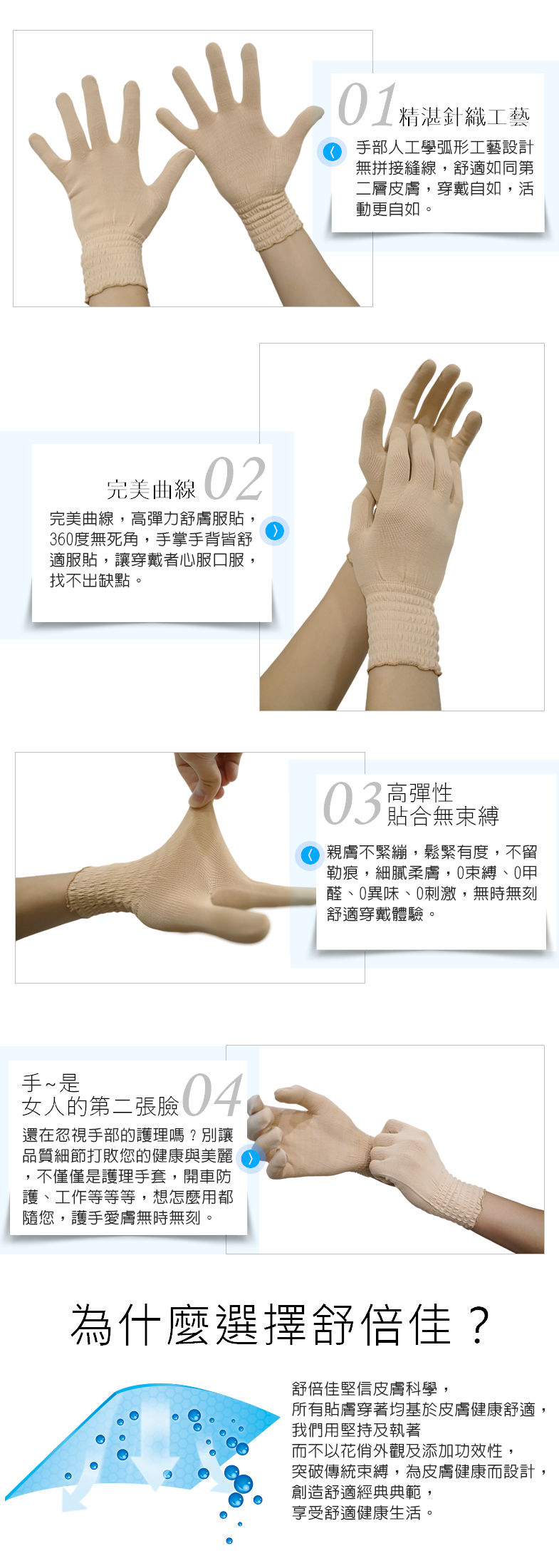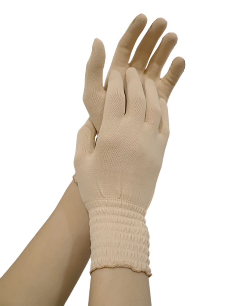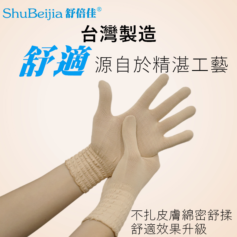 ShuBeijia舒倍佳 舒膚雙向彈力女用護膚養膚針織手套舒適面料沒有編織的添加劑,大多數濕疹織物隨流行而將諸如鋅之類的化學藥品嵌入其織物中,以控制細菌的生長。而ShuBeijia舒倍佳 舒膚棉柔是環保面料無需化學添加劑即可讓穿著者舒適。最佳配比織料製成的面料,透氣性支持人體自然的溫度調節能力。ShuBeijia舒倍佳 舒膚棉柔系列衣著穿戴回歸自然簡單舒適為主旨,讓ShuBeijia舒倍佳 舒膚棉柔衣著穿戴在貼近皮膚而實施科學皮膚管裡時進行有效的護理修復。沒有染料,無化學物質和無鋅。