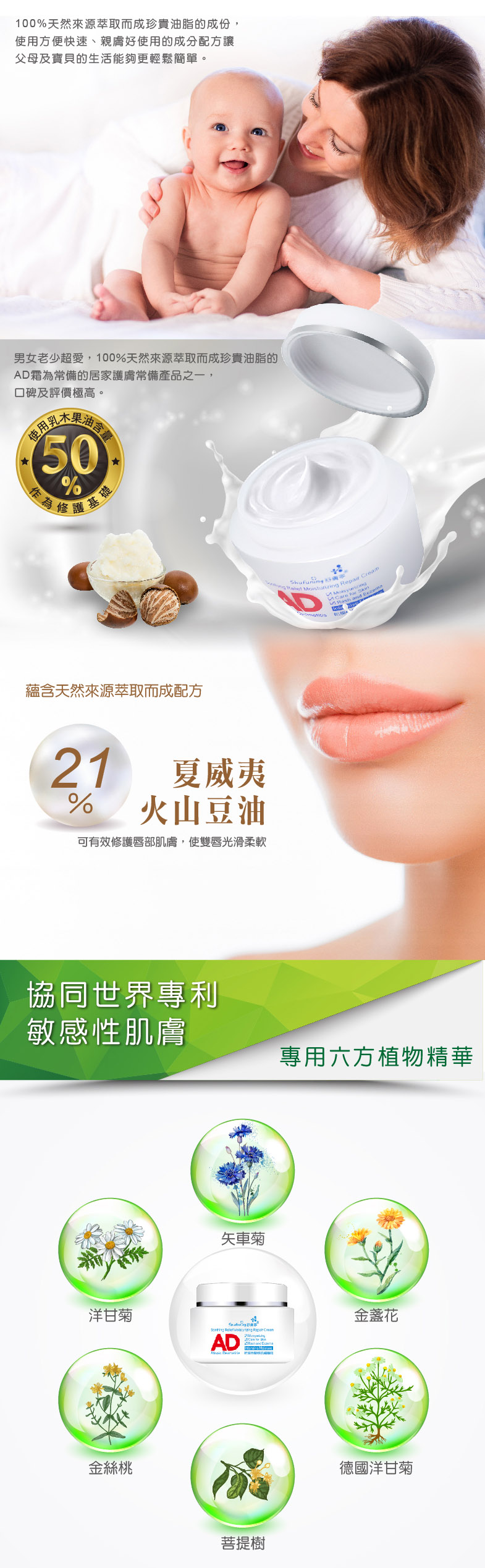 注意事項:此乳霜是100%珍貴純油脂,不建議青春痘臉部肌膚或皮脂分泌旺盛的極油性臉部肌膚使用。建議選擇其他適當的產品使用,例如:高端修復的舒膚寧全效修復乳;請在購買前注意肌膚所需!