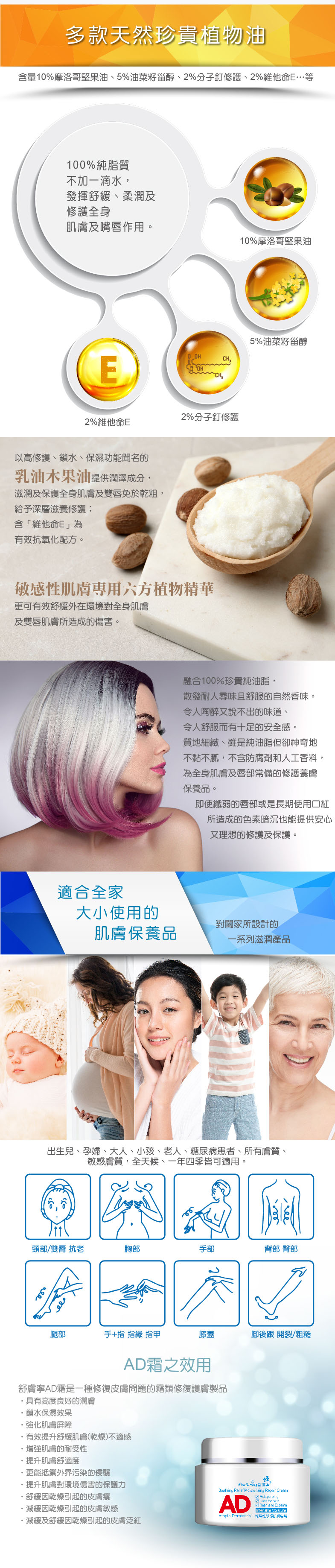 ▏適用者 ▏適合全家大小使用的肌膚保養品,對闔家所設計的一系列滋潤產品,出生兒、孕婦、大人、小孩、老人、所有膚質、敏感膚質,全天候、一年四季皆可適用。一天可以多次使用,想到即用,洗完手後擦乾即膚後即使用,常常隨時用修復著肌膚,可讓肌膚健康完美,展現柔滑幼嫩的膚感 ! 值得您一試-更值得您擁有 !