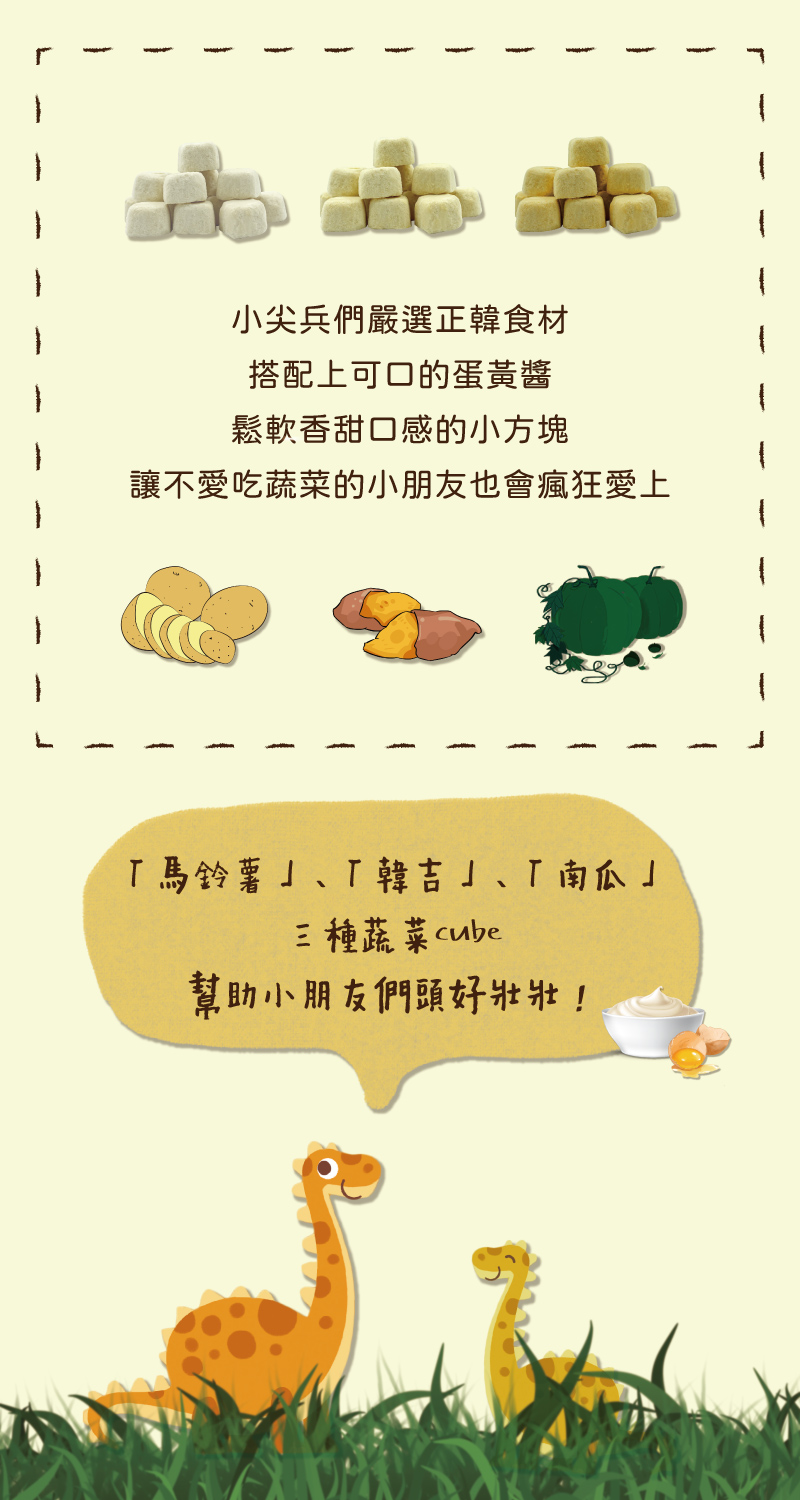 小尖兵們嚴選正韓食材搭配上可口的蛋黃醬,鬆軟香甜口感的小方塊,讓不愛吃蔬菜的小朋友也會瘋狂愛上。