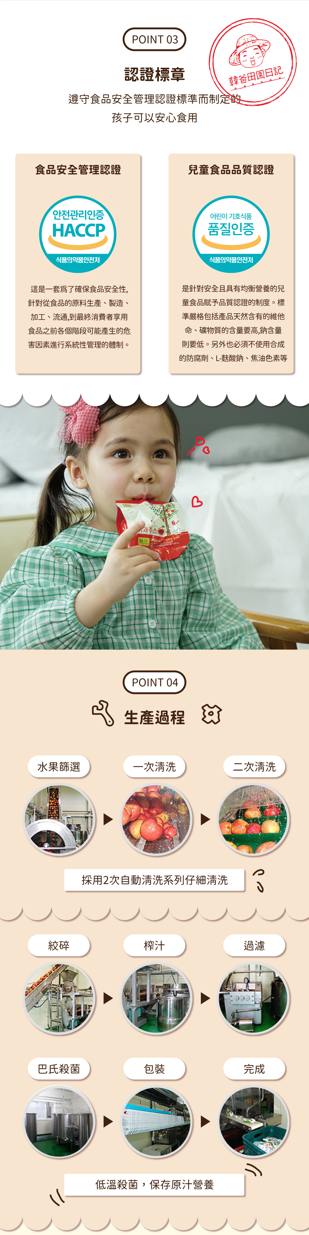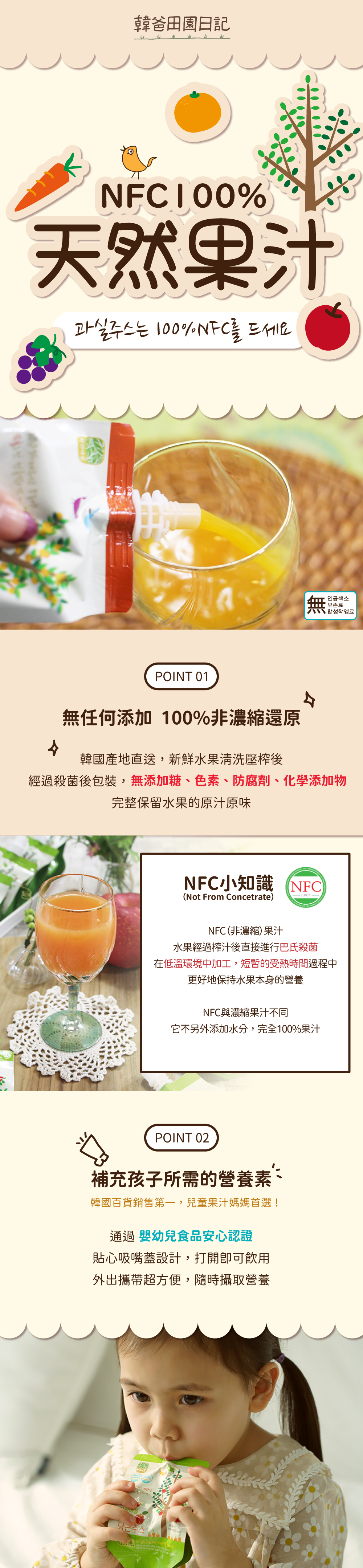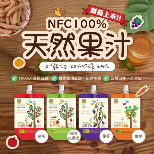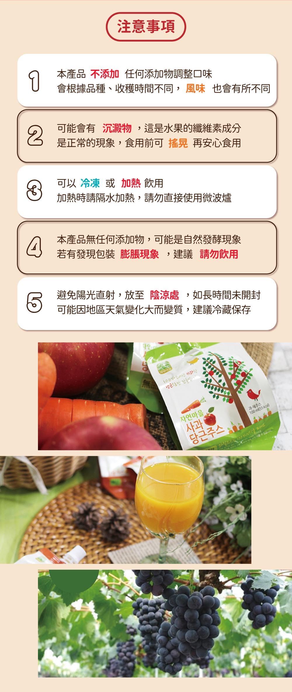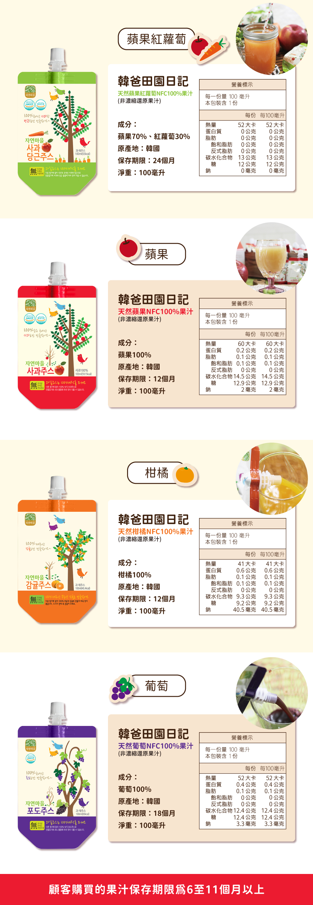 使用韓國原產水果新鮮直送,二次清洗壓榨後,經低溫殺菌保留水果最大營養與風味,是真正的水果原汁。共四種口味:蘋果、蘋果紅蘿蔔、葡萄、柑橘。