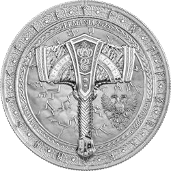 2025 年《Artefacts》系列:雷神之錘 Mjölnir 1 盎司銀幣 BU——象徵風暴與雷霆之神索爾的神話之錘,由矮人工匠辛德里(Sindri)與布羅克(Brokk)鍛造,作為贈予眾神的三件神物之一。
