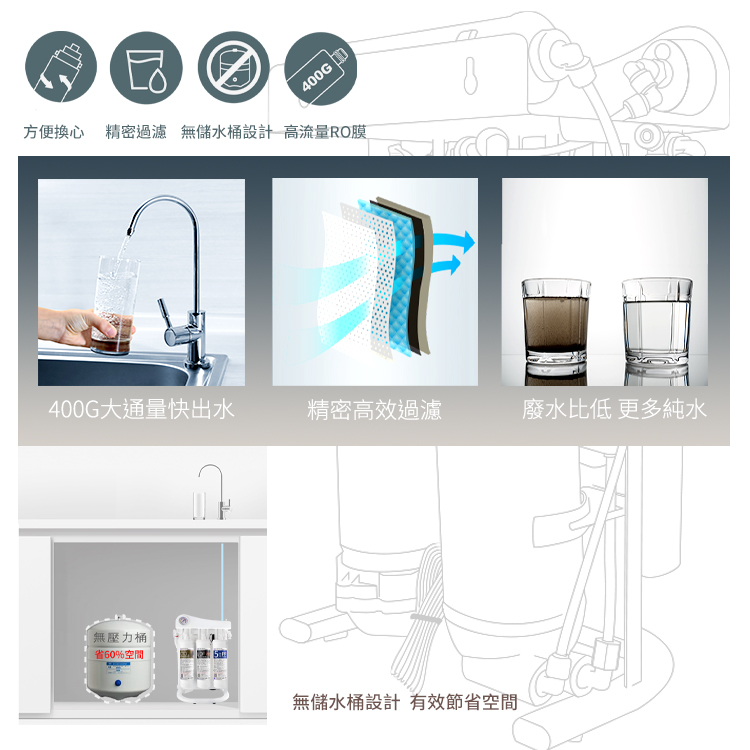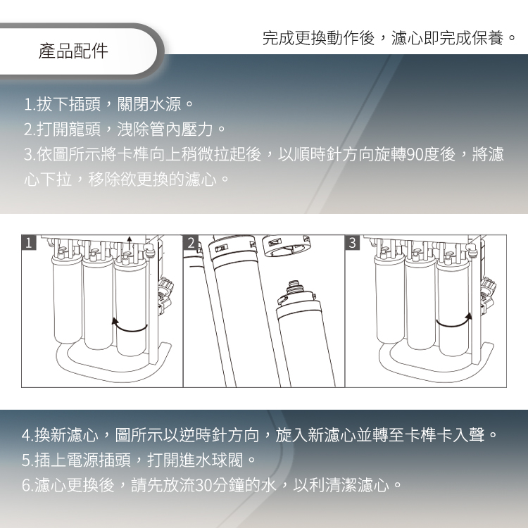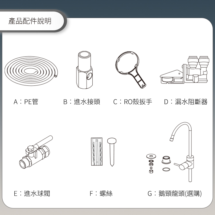 配件:3分PE管、2分PE管、RO把手、螺絲x2、壁虎x2、濾水器轉接頭x1、2分球塞接頭x1、漏水斷路器x1、304鵝頸龍頭
