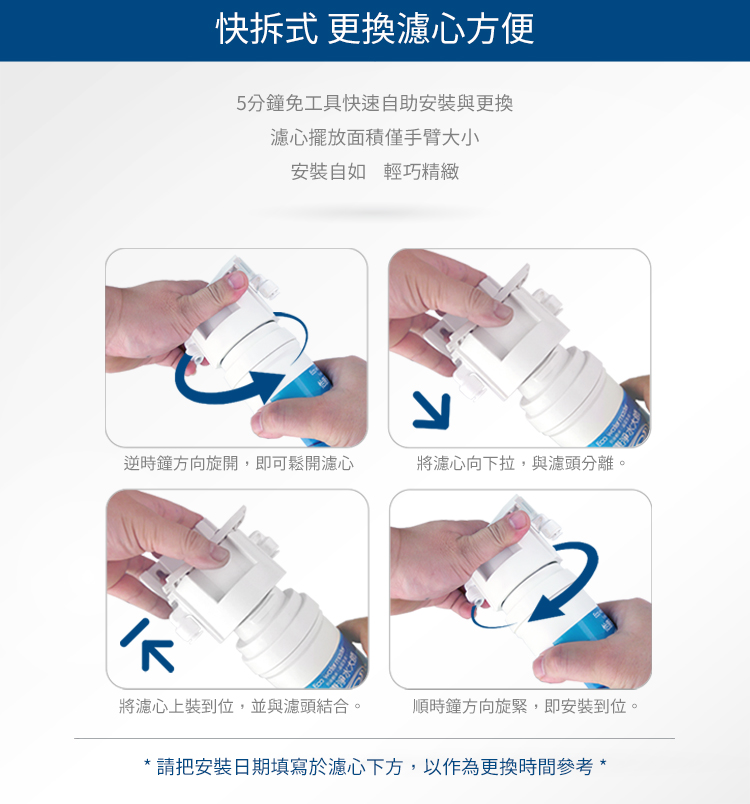 ◆快拆式濾心只需輕輕一轉,即可拆裝自如。