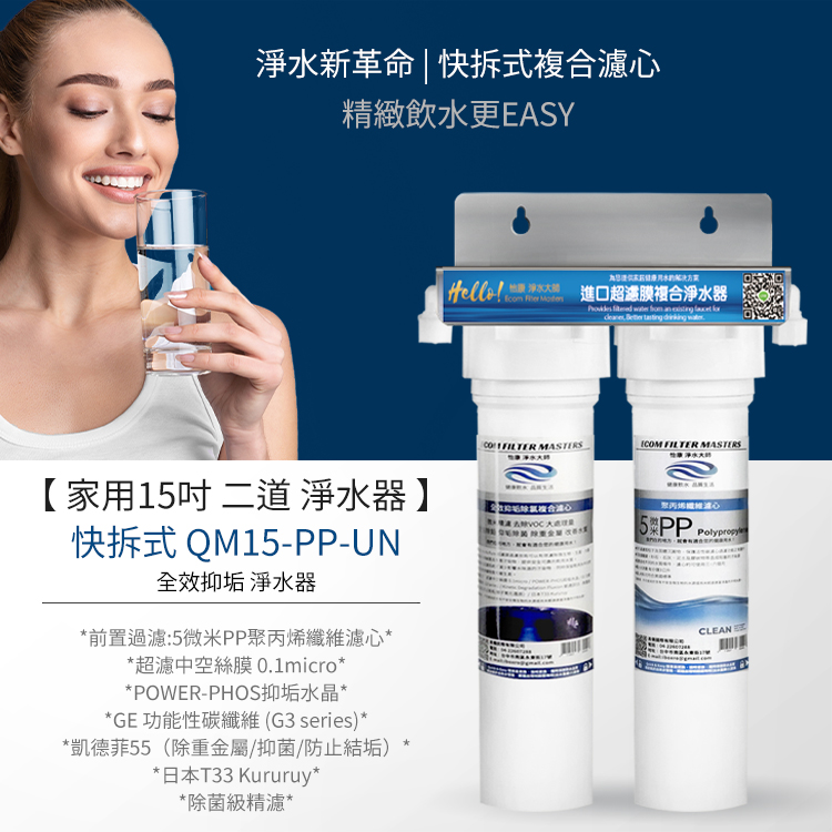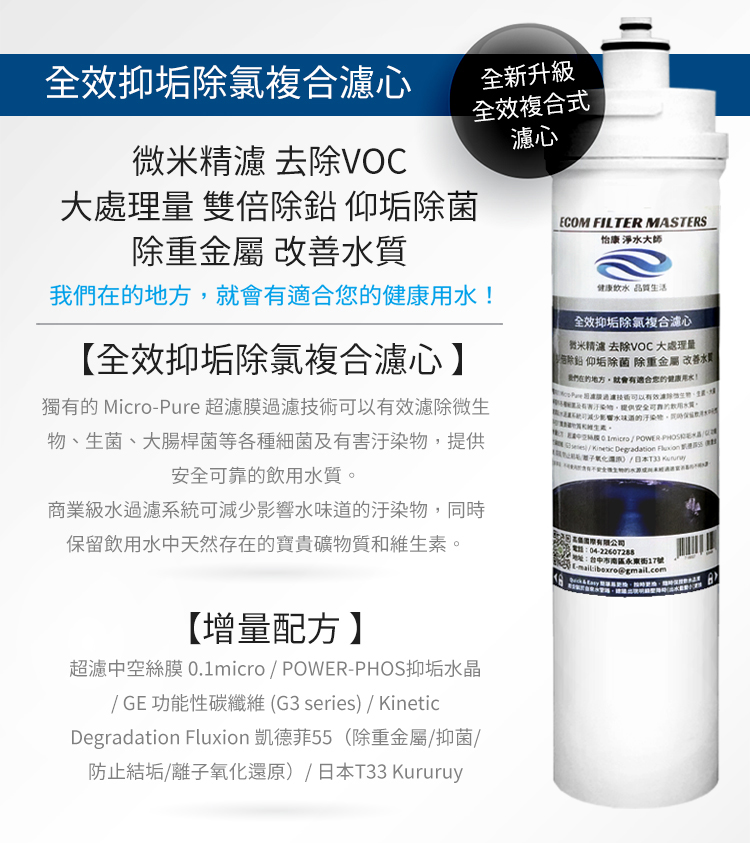 濾心複合:超濾中空絲膜 0.1micro / POWER-PHOS抑垢水晶 / GE 功能性碳纖維 (G3 series) / Kinetic Degradation Fluxion 凱德菲55(除重金屬/抑菌/防止結垢/離子氧化還原)/ 日本T33 Kururuy