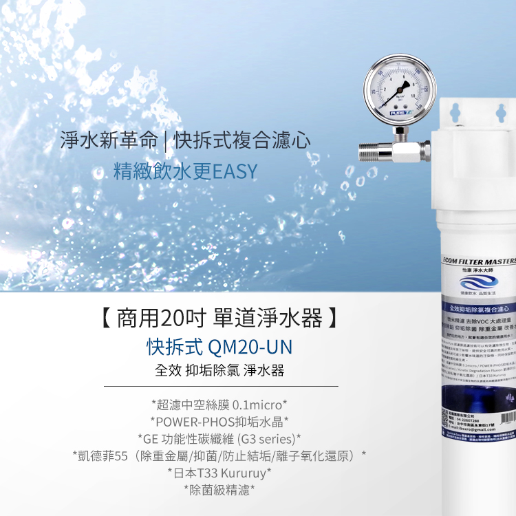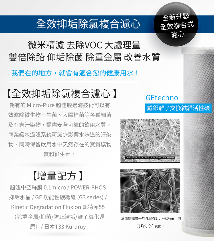 濾心複合:超濾中空絲膜 0.1micro / POWER-PHOS抑垢水晶 / GE 功能性碳纖維 (G3 series) / Kinetic Degradation Fluxion 凱德菲55(除重金屬/抑菌/防止結垢/離子氧化還原)/ 日本T33 Kururuy