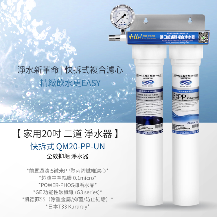 複合濾心:超濾中空絲膜 0.1micro / POWER-PHOS抑垢水晶 / GE 功能性碳纖維 (G3 series) / Kinetic Degradation Fluxion 凱德菲55(除重金屬/抑菌/防止結垢/離子氧化還原)/ 日本T33 Kururuy