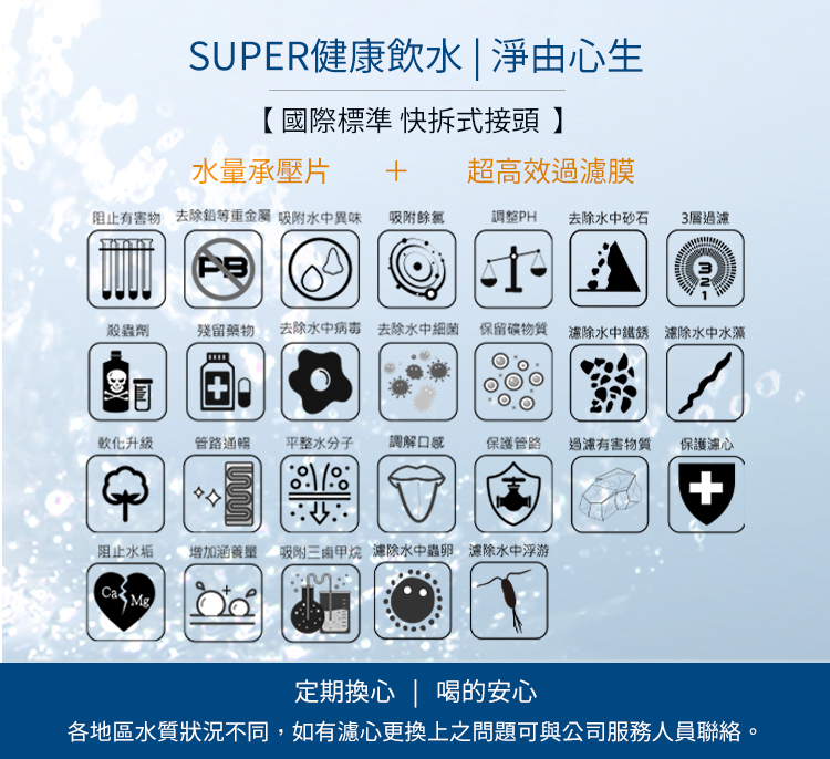 濾材一旦過水使用,即開始過濾水中各種雜質或汙染物,若超過建議更換時間未予更換,將無法確保過濾品質,嚴重將成為細菌溫床,反讓濾水系統汙染。為確保您飲水衛生安全,請定期更換濾心。
