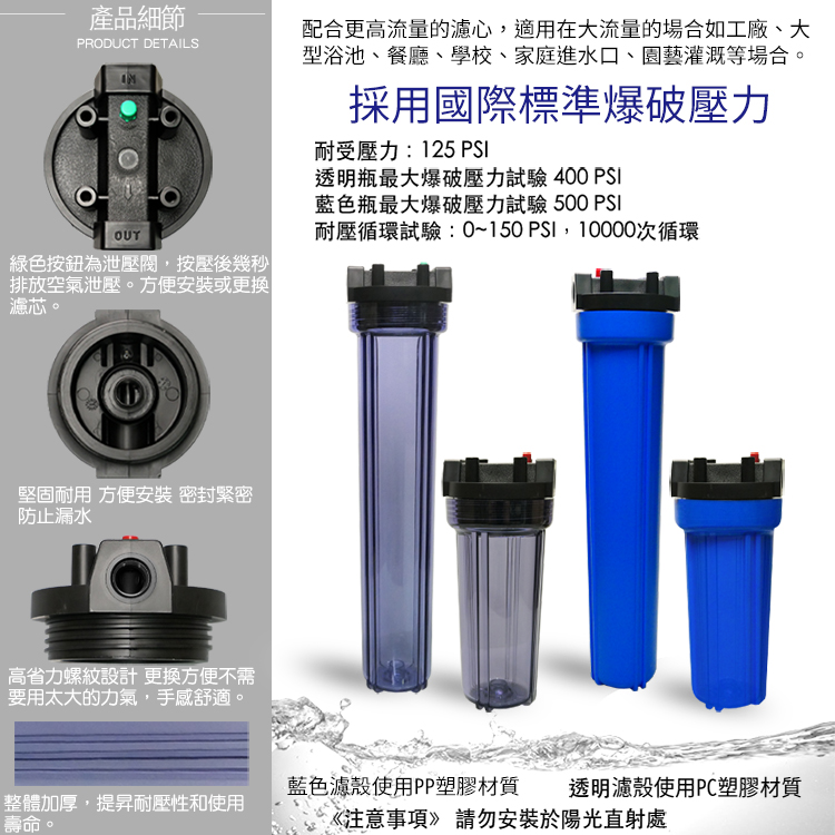 內容:10吋標準濾殼(藍殼)x2、10吋標準濾殼(透明殼)x1、5微米PP濾心x1支、UDF 顆粒活性碳濾心x1支、1微米PP濾心x1支