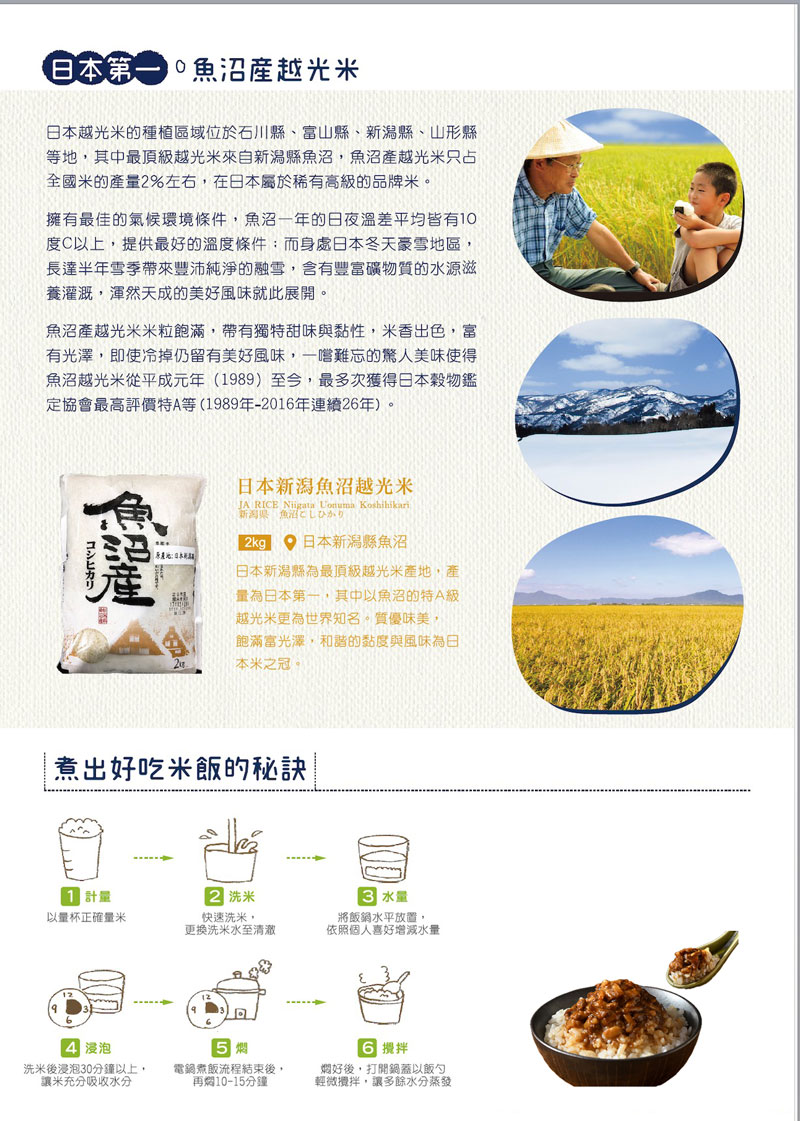 【日本新瀉魚沼越光米】 越光米(コシヒカリ)是日本原產的水稻品種,昭和31年(西元1956年)育種成功,從日本東北到九州各地廣泛都有種植,但不同地區的水土環境不同,培育出來的越光米也有風味和軟硬程度的差別。新潟魚沼產的越光米,在日本穀物檢定協會每年舉辦的「食味排行榜」評選中,連續26年獲得最高的特A級(1989~2016年),也創下唯一最長的連霸記錄!