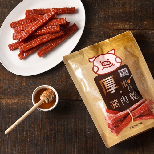 每一條都有獨立真空包裝! 加上獨門秘方和香甜蜜之使豬肉的肉香濃郁、色澤誘人。 選用台灣豬後腿肉,製成厚達1cm的肉條,Q彈蘊含肉汁。