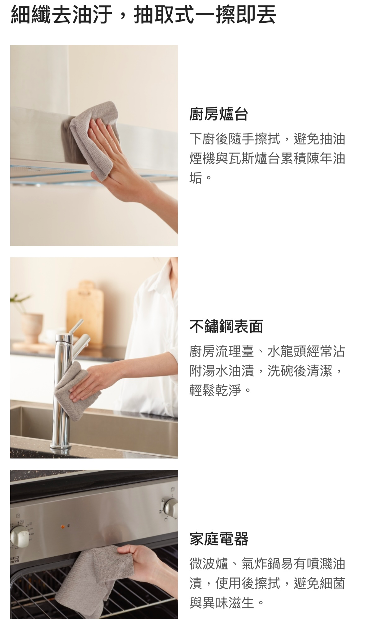 - 超細纖維材質,具有超強吸水去汙力,有效打擊廚房重油汙。
