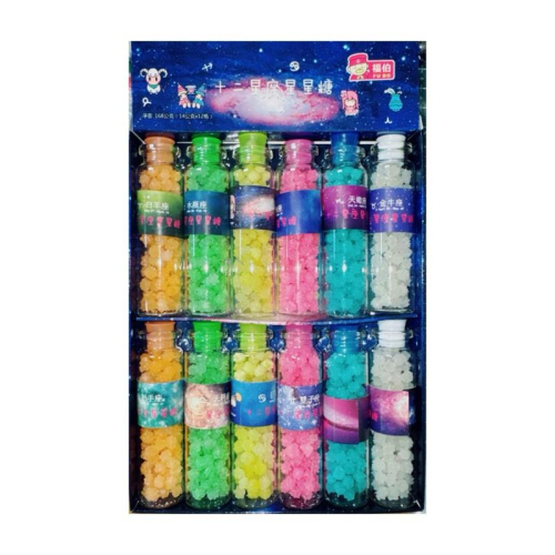 品名:十二星座星星糖 成分:白砂糖,食用色素(紅色七號,黃色四號,黃色五號, 藍色一號,綠色三號,二氧化鈦),香料。 警示:幼兒食用須成人監護,本產品不宜吞咽 效期:2026.004.20
