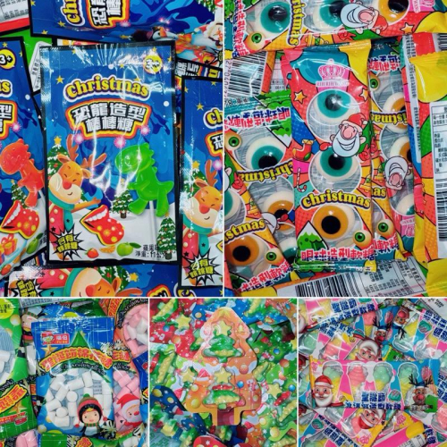 品名:聖誕節恐龍造型棒棒糖 成分: (草莓味)白砂糖,葡萄糖漿,檸檬酸,二氧化碳,香料(草 莓),食用色素(红色四十號)。 (香橙味)白砂糖,葡萄糖漿,檸檬酸,二氧化碳,香料(香橙), 食用色素(黃色四號)。 (蘋果味)白砂糖,葡萄糖漿,檸檬酸,二氧化碳,香料(蘋果), 食用色素(藍色一號,黃色四號)。 效期:2026.07.15 品名:聖誕節眼球造型軟糖 成分:白砂糖、玉米糖漿、明膠(牛皮)、柑橘果 膠、洋菜、椰子油、棕櫚蠟、香料、檸檬酸、 DL-蘋果酸、食用色素(紅色四十號、黃色五號、 藍色一號、植物碳、二氧化鈦)、檸檬酸鈉。 過敏原資訊:本產品含有堅果類及其製品。 效期:2026.07.15 品名:聖誕節棉花糖 成分: (草莓味)葡萄糖漿、白砂糖、明膠(牛皮)、D-山梨醇、 羥丙基磷酸二澱粉、葡萄糖、玉米澱粉、香料(草莓)、檸檬酸鈉、 食用色素(紅色四十號)。 (香草味)葡萄糖漿、白砂糖、明膠(牛皮)、D-山梨醇、羥丙基磷酸二澱粉、 葡萄糖、玉米澱粉、香料(香草)、檸檬酸鈉、食用色素(二氧化鈦) 效期:2026.07.15 品名:聖誕節冰淇淋造型軟糖 成分:白砂糖、葡萄糖漿、明膠(牛皮)、 馬鈴薯澱粉、檸檬酸鈉、檸檬酸、DL-蘋 果酸、香料、食用色素(紅色四十號、黃 色四號、藍色一號)。 效期:2026.07.15 品名:聖誕樹造型軟糖 成分:白砂糖、麥芽糖漿、明膠(牛皮)、D-山梨醇、 麥芽糊精、檸檬酸、柑橘果膠、洋菜、DL-蘋果酸、 香料、食用色素(黃色五號、黃色四號、藍色一號、 紅色四十號、二氧化鈦)、棕櫚蠟。 效期:2026.07.15