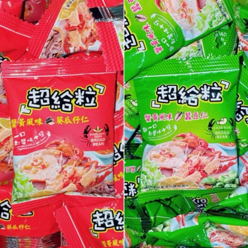品名: 超給粒 蟹黃風味蠶豆仁 成份:蠶豆、糯米粉、玉米澱粉、小麥粉、棕櫚油、白砂糖、 蟹黃味調味料[葡萄糖、蟹肉粉香料、醬油、麥芽糊精、 水解大豆蛋白、酵母抽取物、香辛料(蒜粉、胡椒)、蟹黃 香料、琥珀酸二鈉、紅椒色素、薑黃色素]、抗氧化劑(第三丁基氫醌) 效期:2025.08.14 品名: 超給粒 蟹黃風味葵瓜籽仁 成份:瓜子仁、棕櫚油、小麥粉、白砂糖、糯米粉、玉米澱粉、 蟹黃味調味料[葡萄糖、蟹肉粉香料、醬油、麥芽糊精、 水解大豆蛋白、酵母抽取物、香辛料(蒜粉、胡椒)、蟹黃 香料、琥珀酸二鈉、紅椒色素、薑黃色素]、碳酸 氫銨、抗氧化劑(第三丁 基氫醌) 效期:2025.08.14