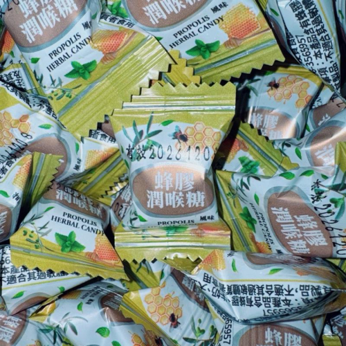 品名:蜂膠潤喉糖 成份:葡萄糖漿、砂糖、椰子油(椰子油、混合濃縮生育醇、 抗壞血酸棕櫚酸酯)、一水葡萄糖、食鹽、蜂膠萃取物(乳糖 小柑橘生物類黃酮、蜂膠萃取液)、香料(尤加利香料、薄荷 腦、薄荷香料)、著色劑(焦糖色素)、大豆卵磷脂 注意事項:本產品含有蜂膠、牛 奶、大豆及其製品,不適合其過 「敏體質者食用。 效期:2026.12.08