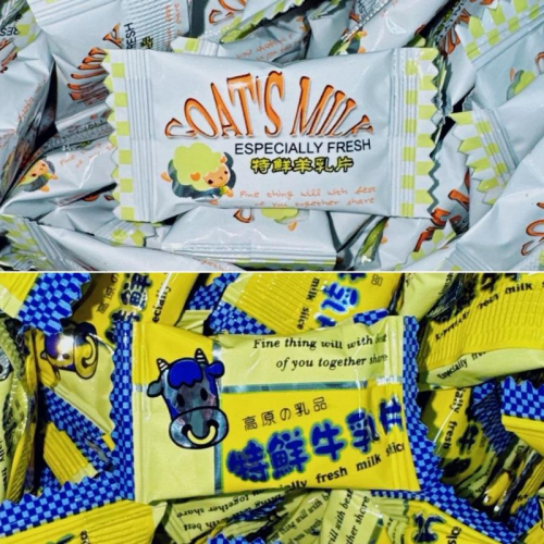 品名:羊乳糖 成份:葡萄糖漿、食用棕櫚油、羊奶粉、乳清粉、白砂糖、乾酪素鈉、 香料、着色劑(食用黃色4號) 效期:2026.06.03 品名:牛乳糖 成份:葡萄糖漿、食用棕櫚油、奶粉、乳清粉、白砂糖、乾酪素鈉、 香料、著色劑(食用黃色4號) 效期:2026.05.08