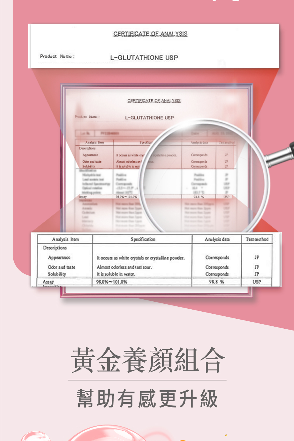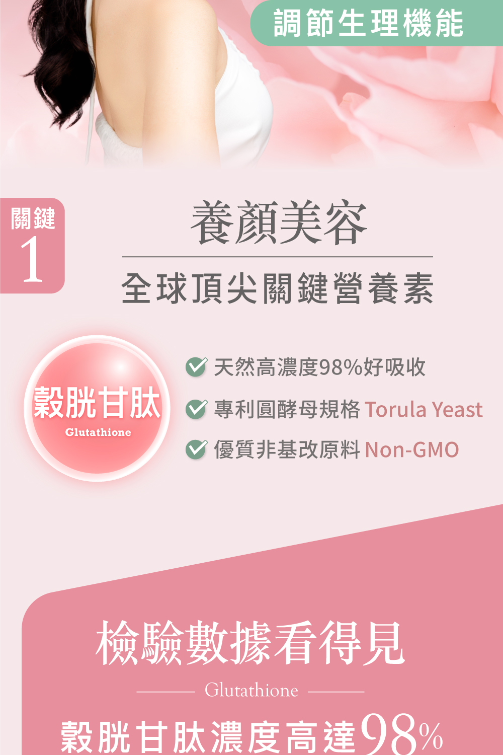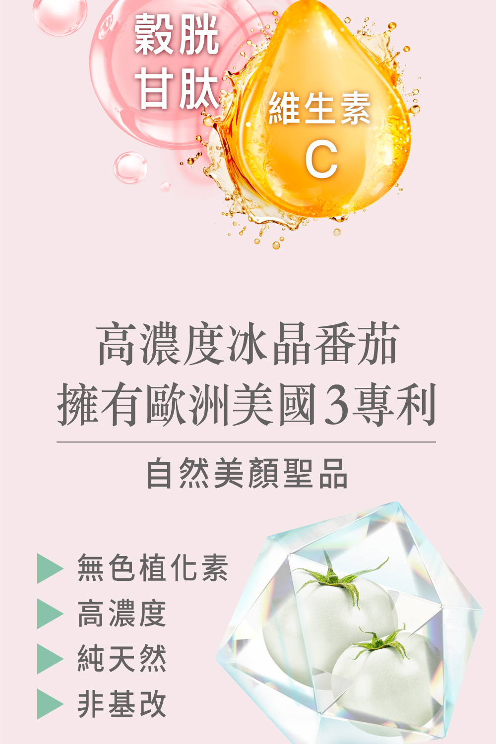 特別添加多種美顏成分,包含專利冰晶番茄、專利穀胱甘肽、白藜蘆醇、琉璃苣油以及專利葡萄籽萃取,還有維他命C、維他命E營養補給,更是養顏美容青春美麗的關鍵!