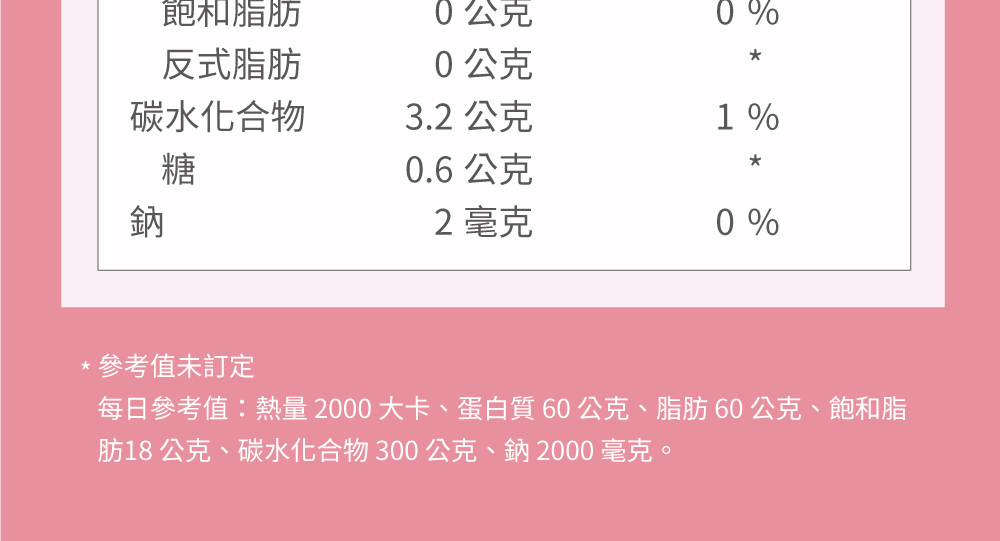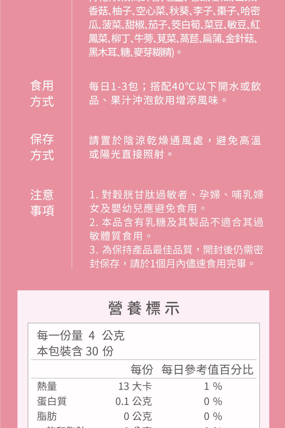 每日1-3包;搭配40℃以下開水或飲品、果汁沖泡飲用增添風味。