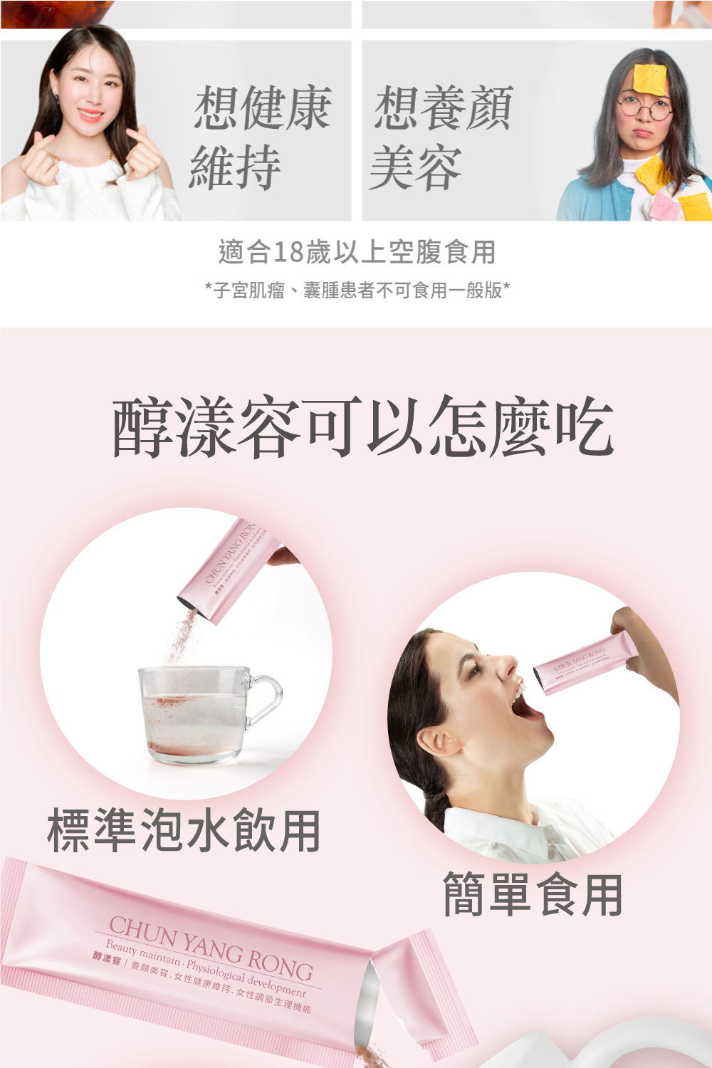 早起空腹食用最佳。建議每天1~3包,1包安心保養,2-3包速效調理,40度以下的開水或飲品沖泡均勻攪拌後飲用。小包裝設計,讓您攜帶方便,外出時可以直接將醇漾容倒入口中搭配水食用喔!