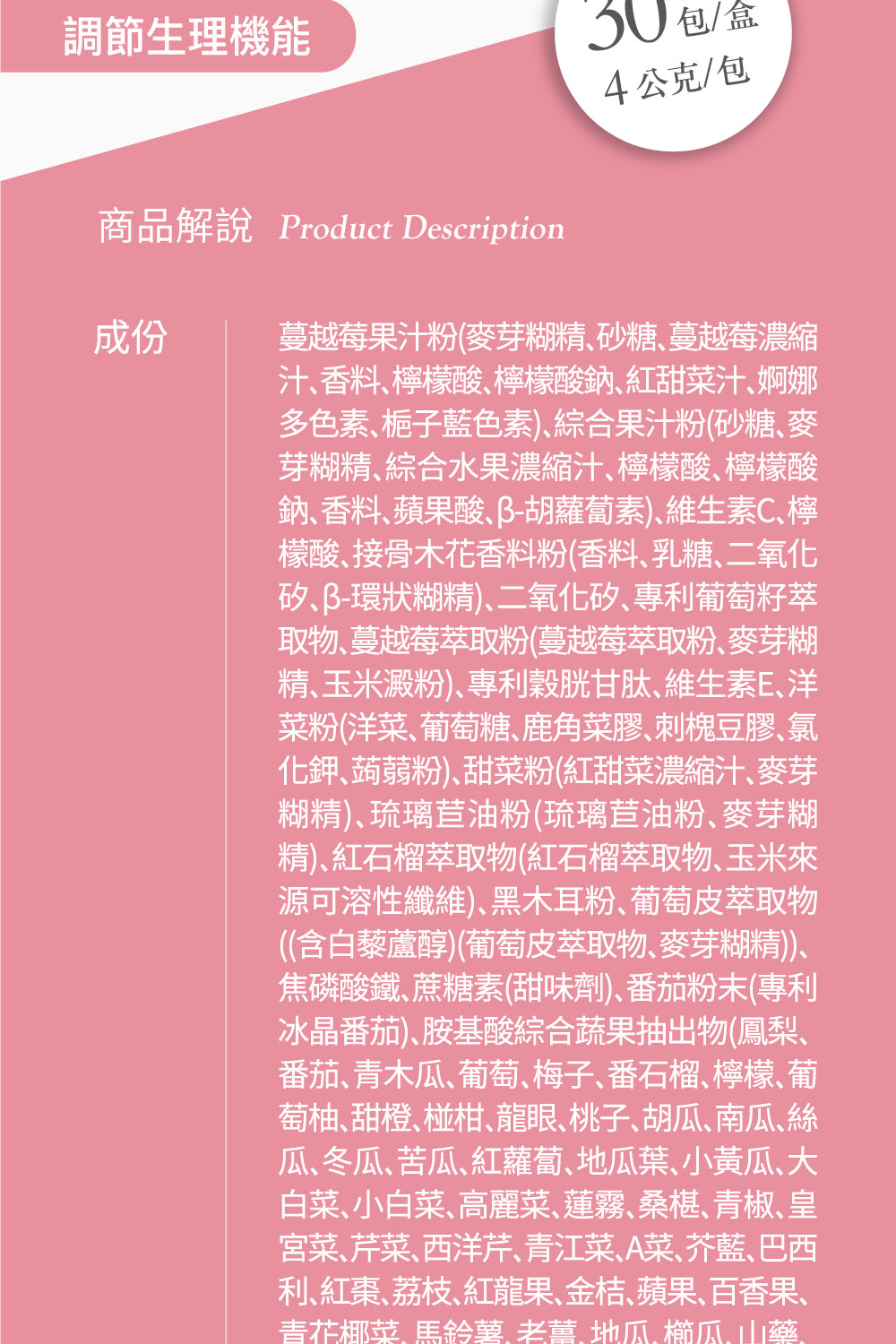 葡萄糖、蔓越莓果汁粉、麥芽糊精、綜合果汁粉、維生素C、檸檬酸、香料粉、專利葡萄籽萃取、果寡糖、二氧化矽、專利穀胱甘肽、維生素E、蔓越莓萃取、洋菜粉(寒天)、甜菜根粉、琉璃苣油粉、紅石榴萃取物、黑木耳萃取粉、紅酒萃取(含白藜蘆醇)、焦磷酸鐵(鐵)、專利冰晶番茄、SOD綜合蔬果酵素粉。