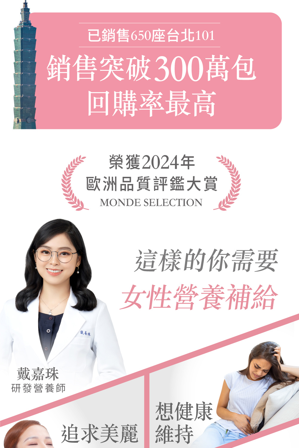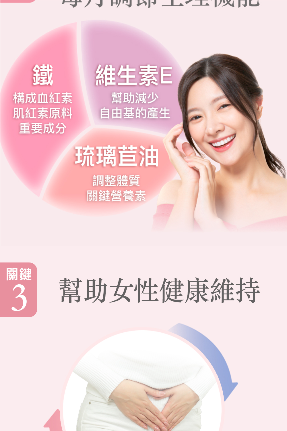 養顏美容、具抗氧化作用、私密呵護、紅潤氣色、營養補給、調節女性生理機能、擁有7項歐美專利